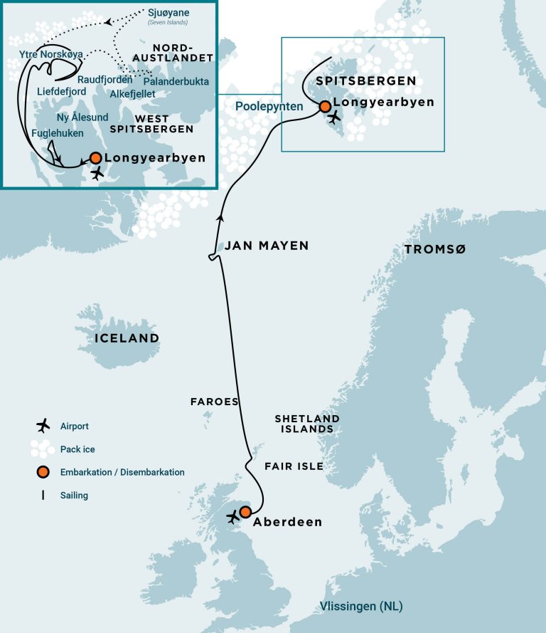 This extensive voyage is a combination of the 10 day Arctic Ocean – Fair Isle, Jan Mayen voyage and the North Spitsbergen Explorer