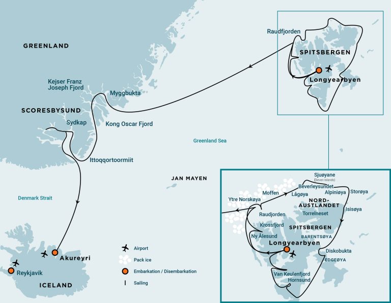PLEASE NOTE: The chances that we can complete a full Svalbard circumnavigation (based on our experiences from 2013—2019) are about 70%. In case we cannot complete a full circumnavigation, we may make a circumnavigation of Spitsbergen through Hinlopen Strait. The probability of sailing into Scoresbysund is high (based on our experiences from 1993 – 2019), but there is still a chance (about 10%) that ice will obstruct passage into the fjord system. All itineraries are for guidance only. Programs may vary depending on ice, weather, and wildlife conditions. Landings are subject to site availabilities, permissions, and environmental concerns per AECO regulations. Official sailing plans and landing slots are scheduled with AECO prior to the start of the season, but the expedition leader determines the final plan. Flexibility is paramount for expedition cruises. The average cruising speed of our vessel is 10.5 knots.